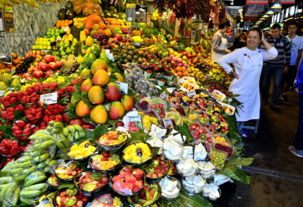 Caption: The Boqueria market in Barcelona, Spain is an excellent expression of the globalization of human food, with delightful treats from every region of the world artistically displayed for the shoppers.